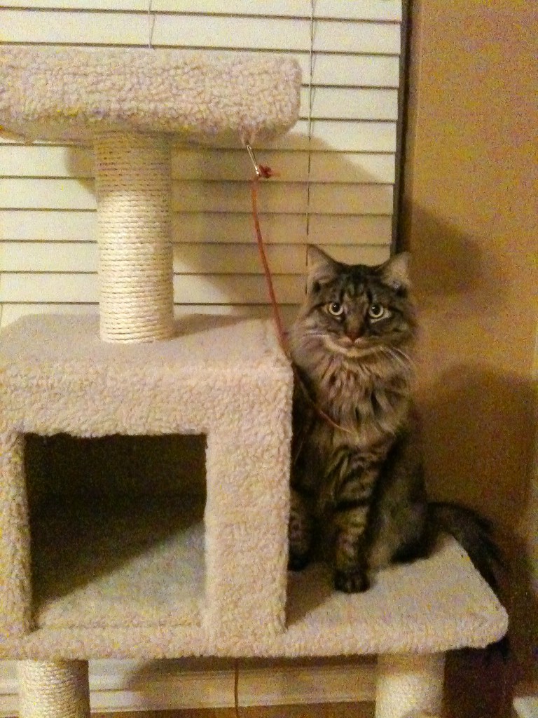 Misty was about 2.5 years old in this photo. We lived in a two-story house with a basement. She loved to run upstairs then run back down and leap to the top of her kitty condo, making it rock back and forth. She was very feisty! If the basement door was open she would run down to the basement and then up to the 2nd floor and back down. She followed me around the house. If I was doing something in the basement she would be down there with me. If I was watching tv, she would be in my lap.