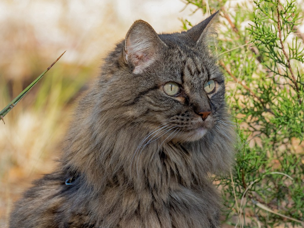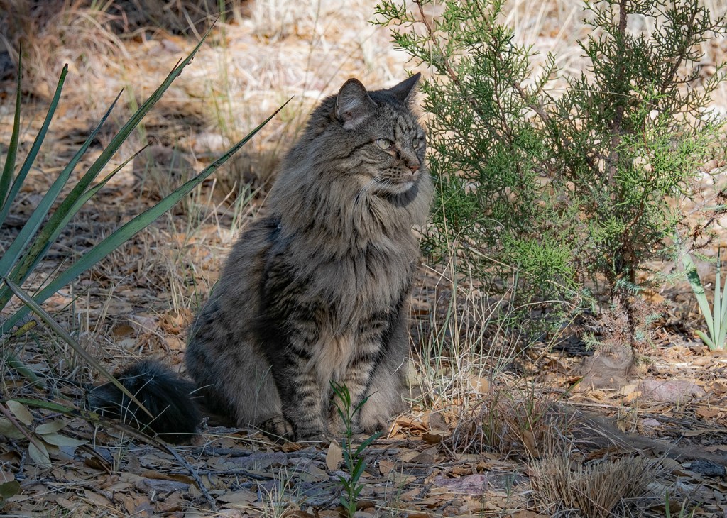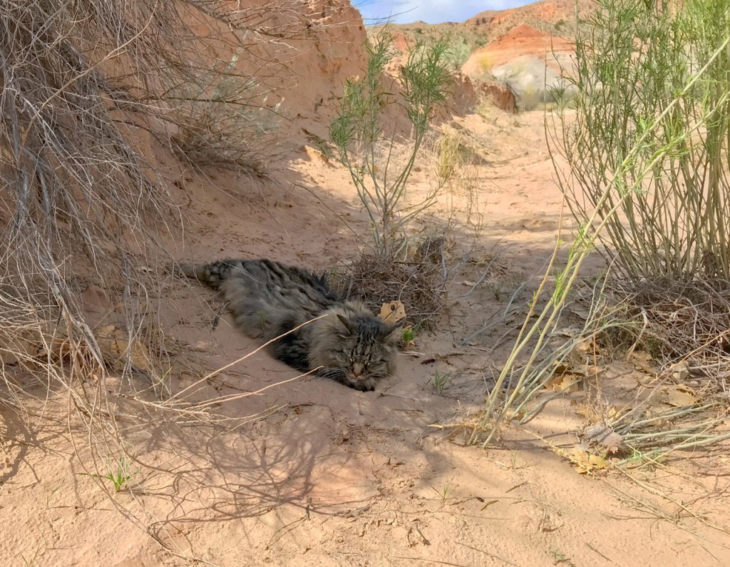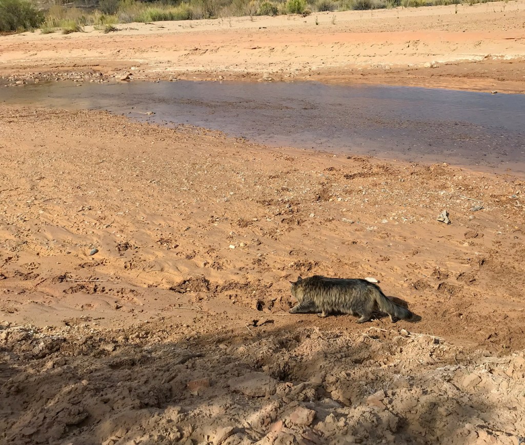 I was unsure how well Misty would adapt to our new lifestyle, but she loved it from the beginning. She particularly loved the desert. We would go out for morning walks. She would explore around our camp with me staying close by. She would stalk lizards but had little chance of catching them with all the prickly plants. But if it did look like she might catch something, I would discreetly walk up to scare it away. She would give me a reproachful look for doing so.